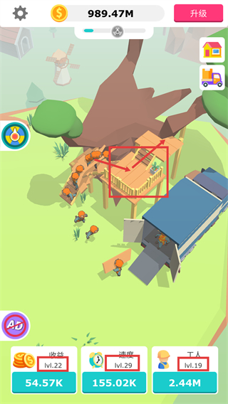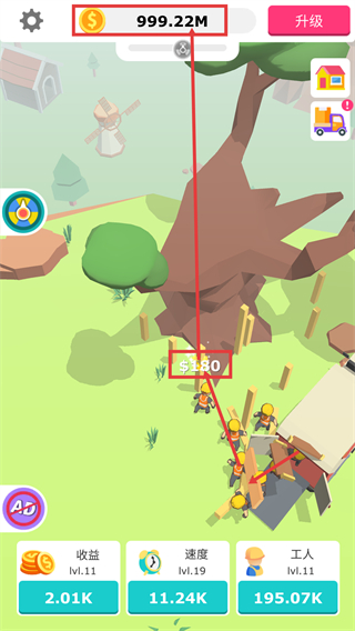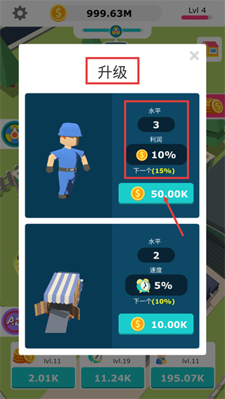 1、在【升级】界面消耗【50.00K】金币升级工人,可提升【利润-10%】,助力资源获取效率。