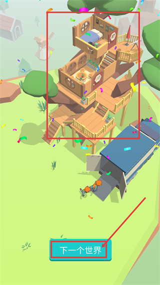 4、建筑完成后点击【下一个世界】,可进入新场景继续发展,拓展更多资源获取渠道。