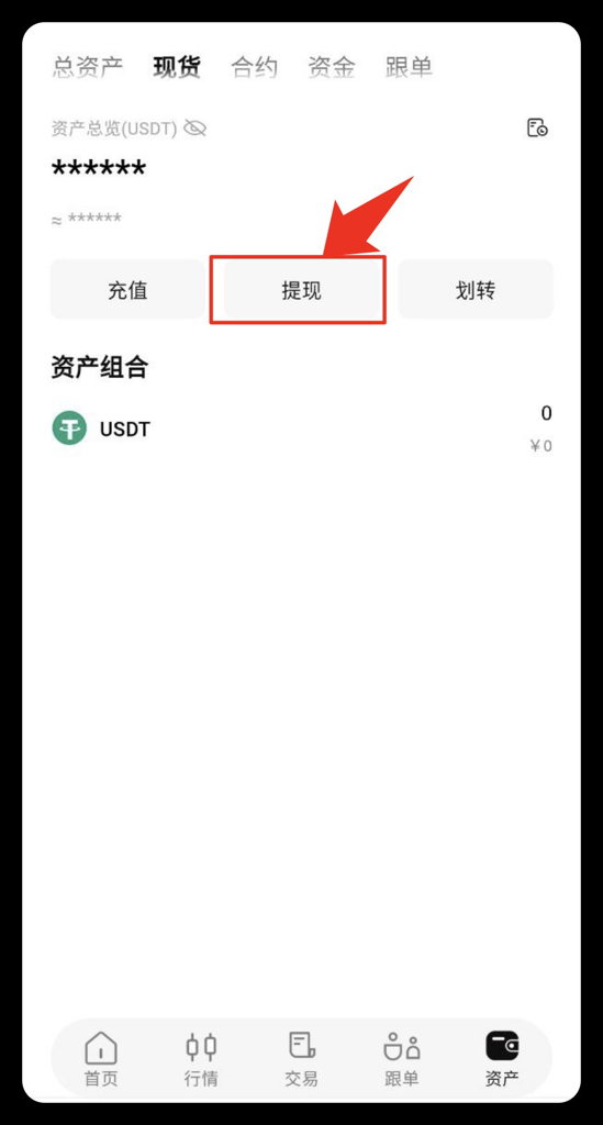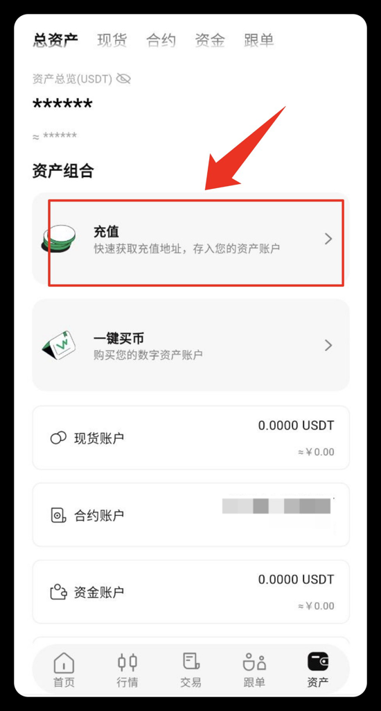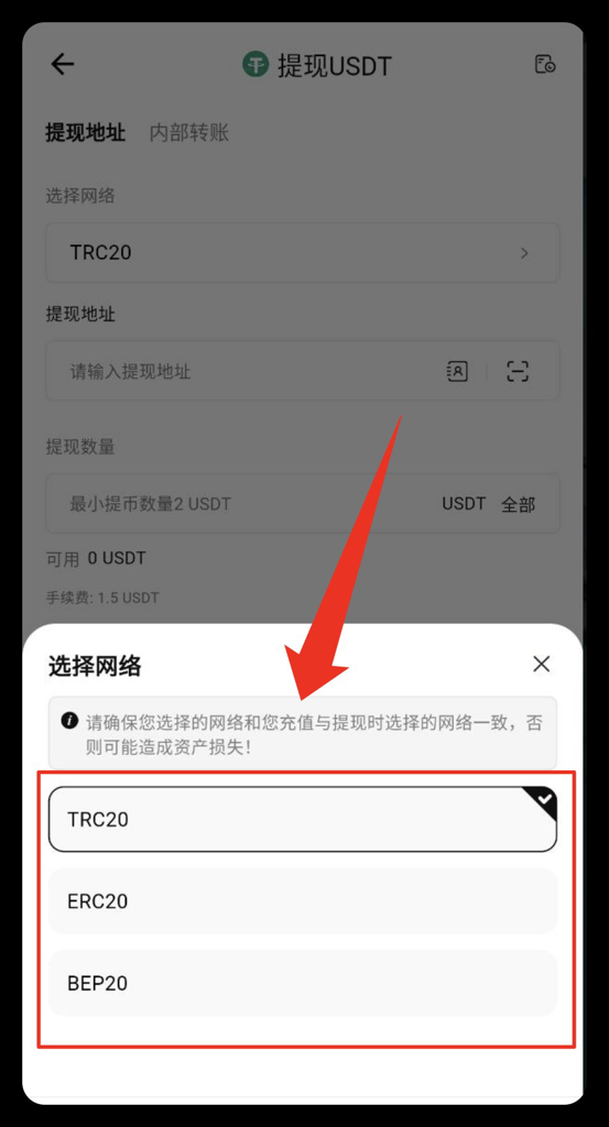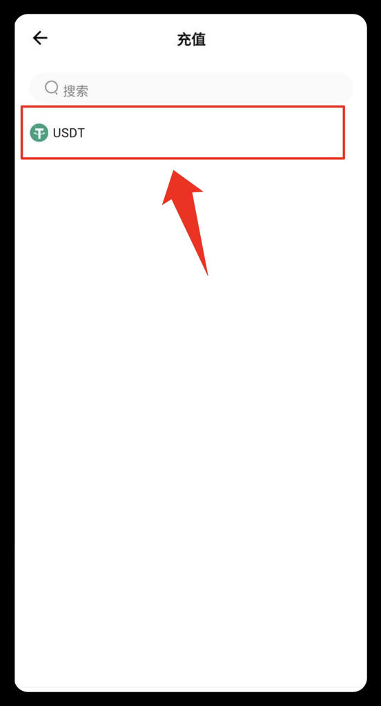 充值页面选择币种(如USDT),然后选择对应的链上USDT。