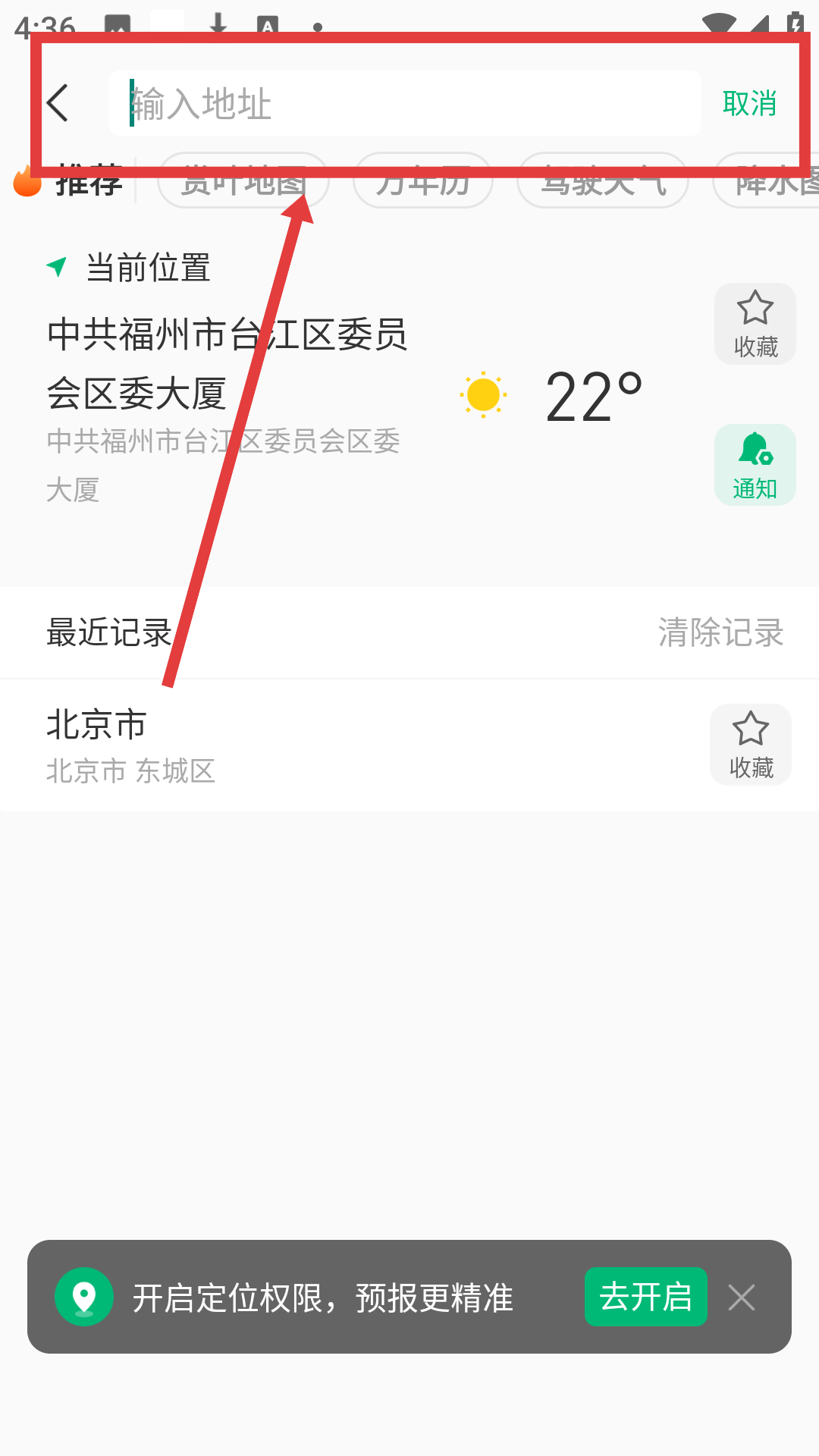 2、在地址选择界面,点【输入地址】栏,可输入城市名称查找天气啦。