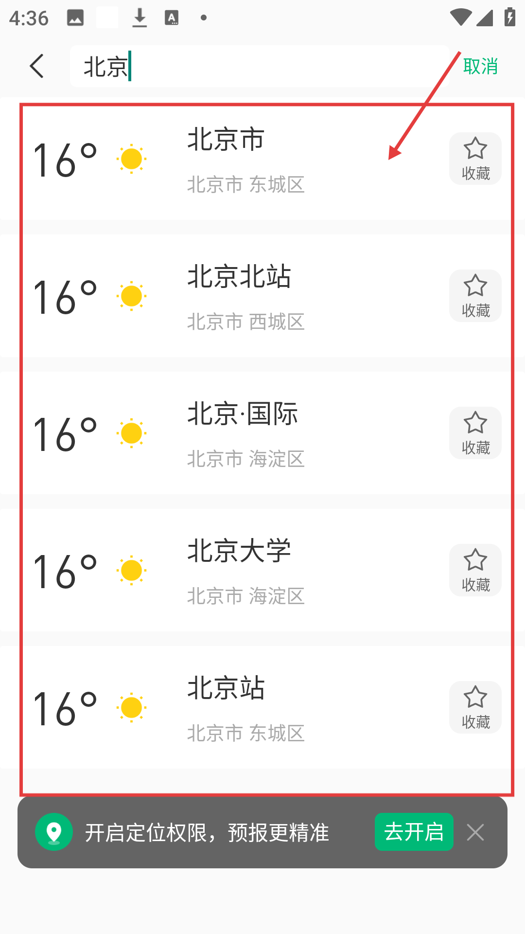 3、输入城市名后,会出现相关地点列表,按需选择地点查看天气呢。