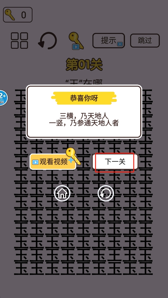 4、点击“下一关”按钮继续游戏。