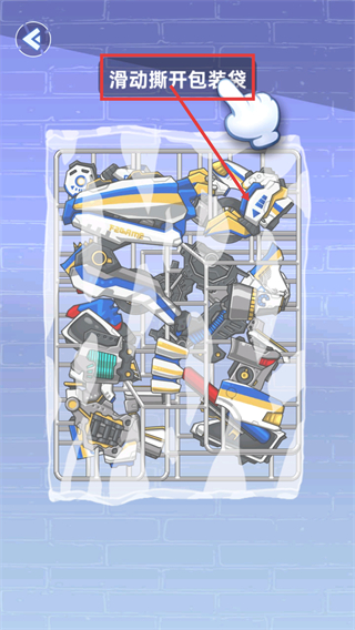 1、按照【滑动撕开包装袋】提示操作,滑动屏幕打开包装以获取机甲零件,推进拼装流程。