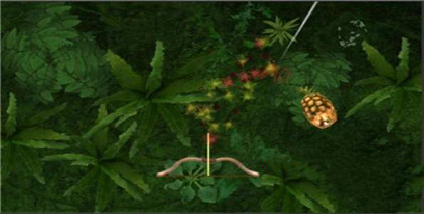 2、玩家通过拉动弓箭,射中水果获取分数。