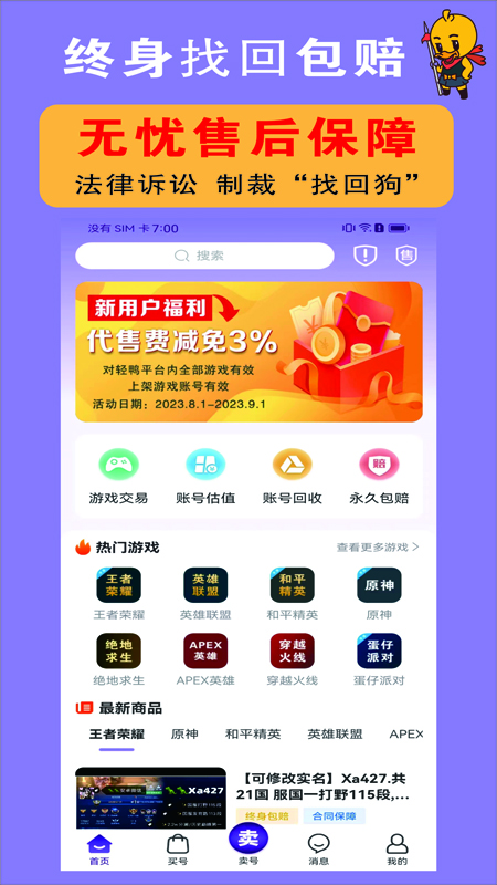 轻鸭代售是一款覆盖手游、端游、国际游戏等全类游戏交易平台,让你轻松买卖游戏账号,享受快速、安全的体验。这里不只提供买号、卖号、账号回收和估价等专业服务,还覆盖二手商品交易,从电子产品到家居用品都能找到心仪物品。平台采用电子合同签署和永久包赔服务,确保每笔交易都有法律保障,全程陪伴你完成交易之旅。