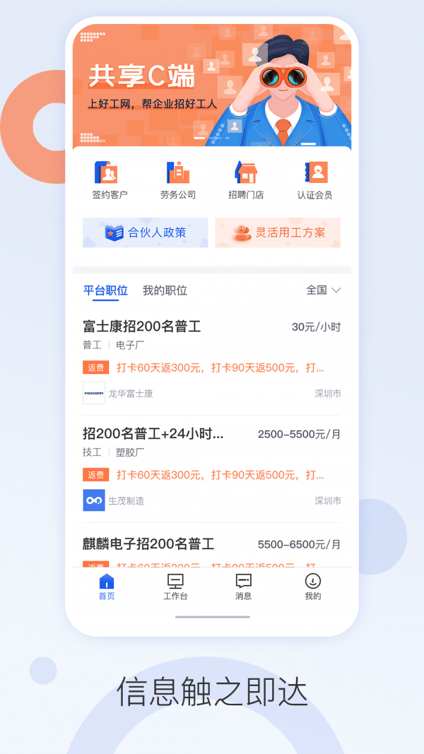 对于求职端,提供覆盖全国的普工、技工、实习生等海量职位,信息均经过实地考察与严格审核,确保真实可靠。求职操作极为简便,可实现一键报名、极速入职。还集成了一系列工作与生活服务,包括在线查工资、考勤打卡、小额应急借支、技能培训课程以及交友互动社区,致力于满足蓝领工作者全方位的需求。对于劳务机构与企业端,则提供了强大的一站式招聘与管理工具。功能涵盖一键发布职位(发单)、上传与管理员工工资单、线上审批员工借支、查看员工考勤与黑名单、智能匹配人职信息等。通过数字化看板,管理者能直观掌握招聘进度、员工状况与各类数据报表,实现对下属门店与招聘专员的智能化管控,显著提升招聘效率与管理水平。