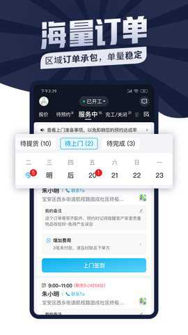 2、师傅们可以方便地管理自己的工作日程,接受稳定的合作指派订单,保障订单收益。