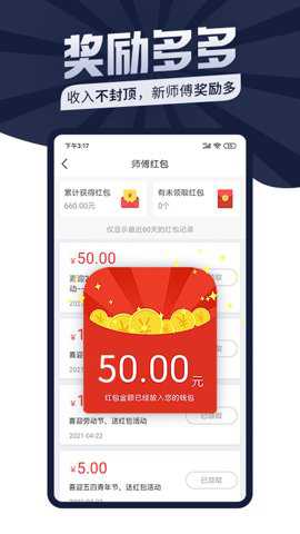 3、平台不定期推出现金红包、接单奖励活动和积分商城,让师傅们有机会兑换各种实用的奖品。