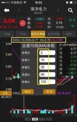 7、大盘、个股的分时线、日K线如何切换,点击大盘或个股,我们将看到大盘或个股当天日K线走势,点击日线旁边的1分钟、5分钟、30分钟等分时线,您也可以左右滑动查询相关分钟线,您也可以根据自己的投资需求,设置自定分钟线或自定日线,甚至设置MA指标线的参数。
