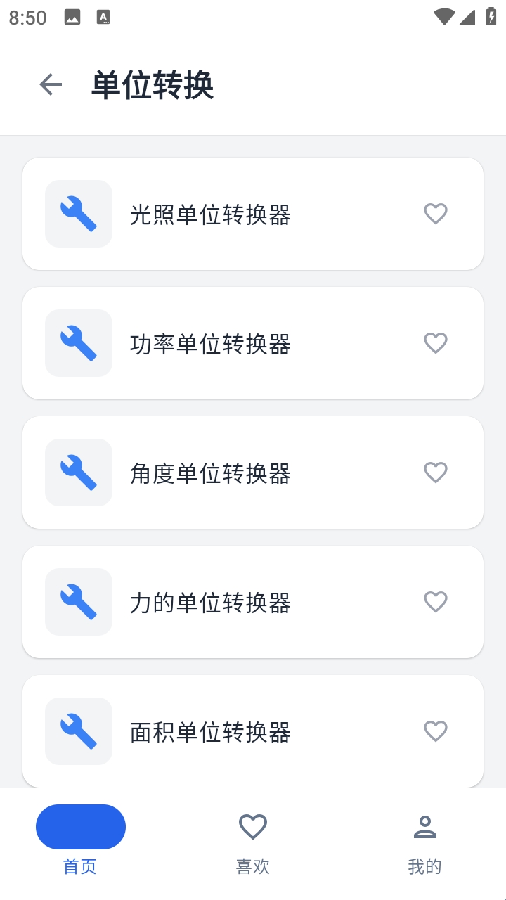 2.在单位转换页面,可以看到光照单位转换器、功率单位转换器、角度单位转换器等