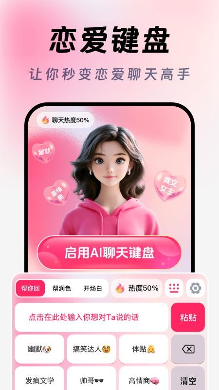 全能AI帮回键盘app主要帮助用户轻松实现恋爱聊天回复,这里为用户提供了专属的恋爱键盘,帮助用户实时进行恋爱聊天,高情商回复对方,有效实现表达内容的优化,随心调节自己的聊天热度,更好的把握节奏;而且用户也可以对更多的人设进行打造,便捷实现多种人设的设置。
