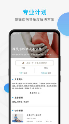 将专业康复训练转化为居家可完成的趣味任务。 2. 游戏化进度设计,通过勋章奖励提升坚持动力。 3. 温暖语音指导模拟私人康复师陪伴体验。 4. 3D解剖动画直观展示损伤机理与恢复原理。 5. 自定义主题界面,支持更换配色与背景音乐。 6. 年度康复盛典活动,有机会获得专家面对面指导。 7. 跨界联名课程,如瑜伽康复、游泳损伤预防等。 8. 公益板块可捐赠康复里程,助力特殊群体康复。
