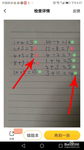 5.拍摄完毕后,小猿口算APP就会对作业进行检查,画面中标记绿色的为答案正确,标记红色问号的为答案错误