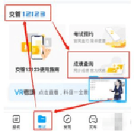 2、把底部导航栏切换到考试的页面中,然后下拉页面。找到跟交管12123(安卓系统下APP版本,V2.8.7)相关功能,点击进入成绩查询;