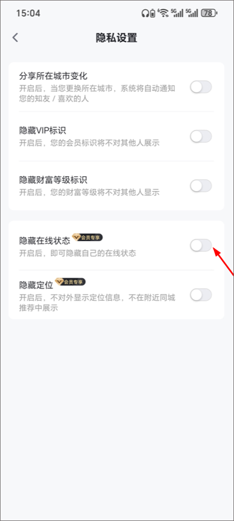4、找到“隐藏在线状态”,点击右侧开启即可隐藏在线,但是需开通APP会员才能开启。