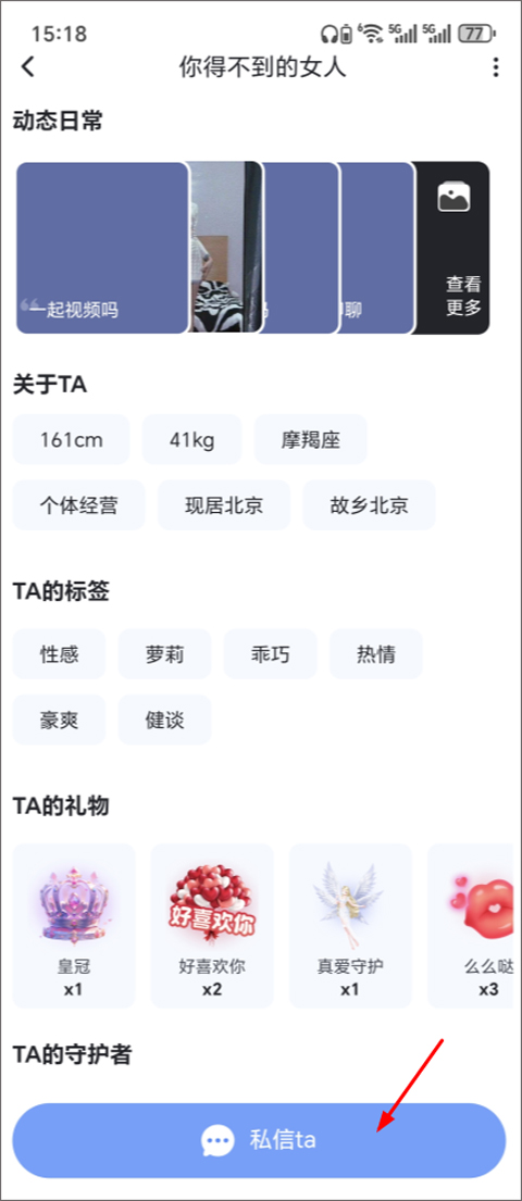 2、接着下滑,点击私信ta;