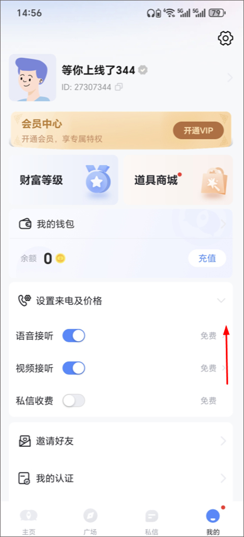 3、打开知聊app,点击右下角“我的”,再点击收费设定,就可对陌生人和好友进行收费。(需开通会员,并达到VIP4)