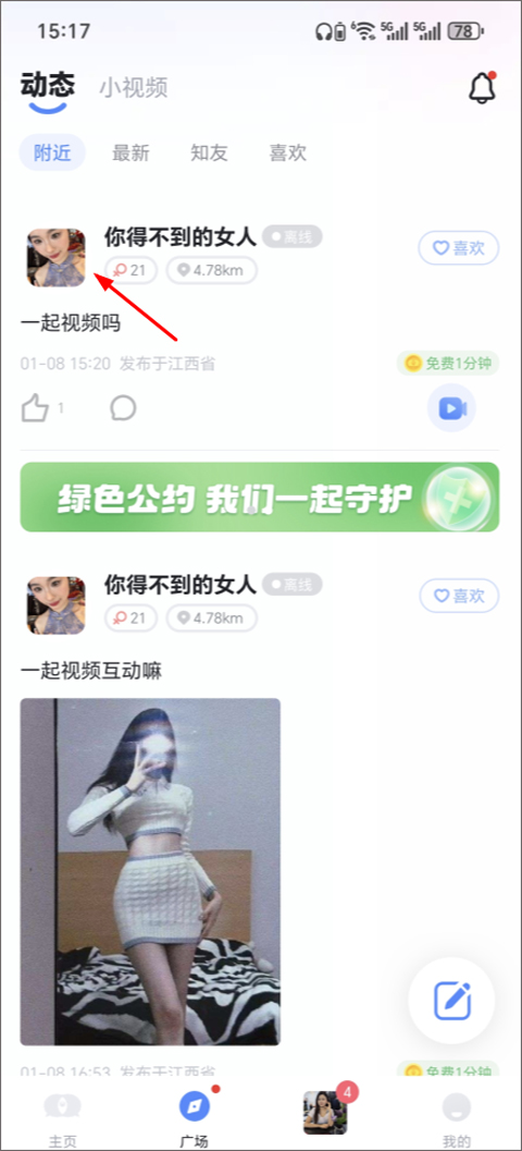 1、进入app后,点击广场,找到一个想添加的好友,点击其头像;