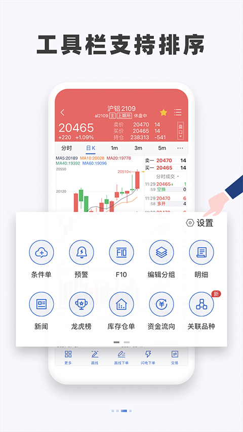 交易:包括三键下单、传统下单、条件单、画线下单、止损止盈、止损开仓、条件单附带止损止盈、银期转账、行权、结算单查询、修改密码等功能。对于一些功能有新手引导说明,更加便利于新用户的上手操作。