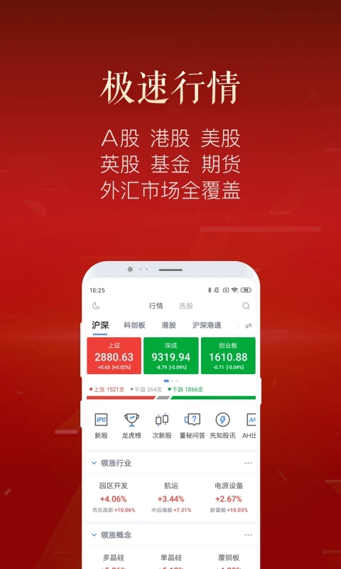 1、在软件的首页中包括了A股、环球、基金、期货、美股、港股、外汇、沪深港通、债券、新三板、期权、数字币、沪伦通、科创板、MSCI指数、ETF等功能。