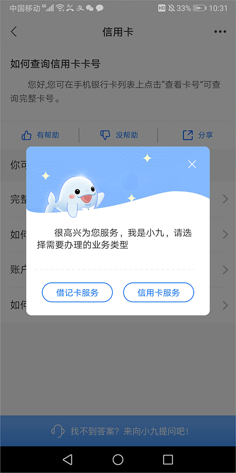 也可以进入九江银行信用卡app,即九江银行app的在线客服页面中,选择【信用卡服务】点击进行咨询