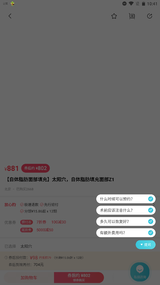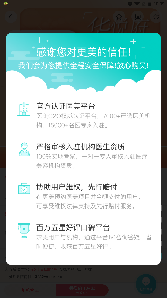 除此之外,如果用户只是想打打玻尿酸、水光补水、除皱瘦脸等美容项目的,那么在这里也是有提供套餐购买服务的,可直接在线购买,接着预约时间线下消费就好了,当然为了跟随现在的电子商务趋势,更美医美软件也支持部分项目的分期付款,其中还包括各种意外险服务,这些都可以让用户能够微整无负担,可以说十分的方便,有感兴趣的朋友欢迎前来下载。