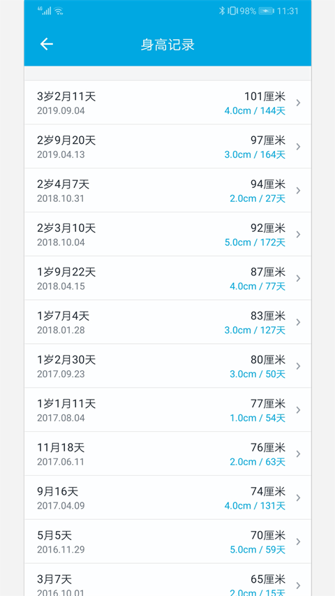 6、可以在线记录身高,能够查看记录列表,可以随时浏览身高变化情况;