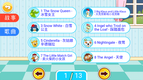 7、点击第四个故事歌曲,这里面有很多个英文歌和故事,选择其中一个,它会自动播放。