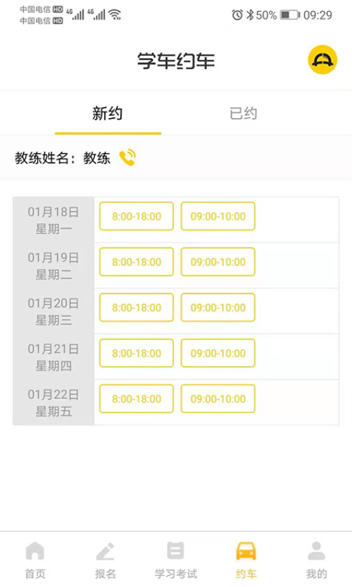 用户可以随时在线向教练约车练车,可自由选择约车的时间段前往驾校练车。