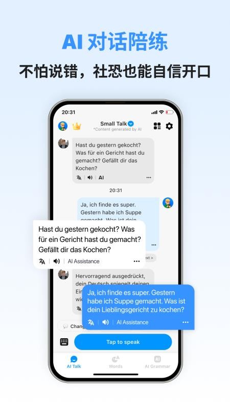 强大且智能的AI对话陪练学习模式,可通过语音对话的方式练习德语口语;