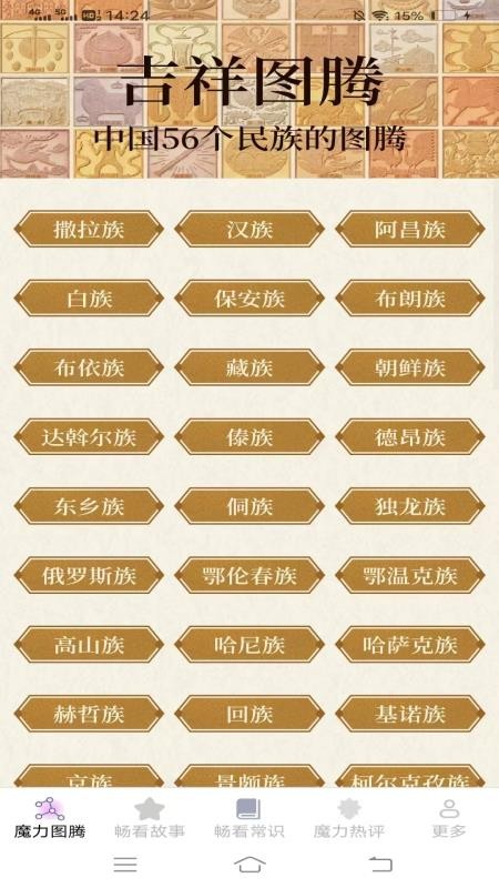 在魔力图腾功能中可以查看到56个民族的吉祥图腾详情内容进行了解。