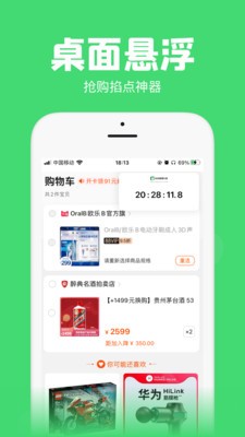 拥有两种悬浮模式,时钟模式和倒计时模式。可以在任意APP上悬浮,秒杀必备神器!