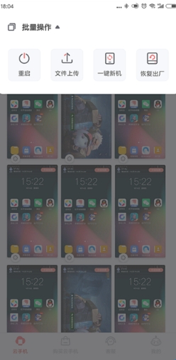 A:登录红手指账号,进入“云手机”列表界面,手机端下拉云手机屏幕两次看到功能界面。功能包括刷新、修改名称、红豆兑换、授权管理、文件上传、重启、恢复出厂、屏幕分享等。
