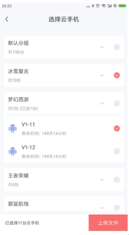 在群控管理功能弹框选择“文件上传”,跳转至云手机选择界面,选择需要批量上传文件的云手机或者任务组,点击“上传文件”;