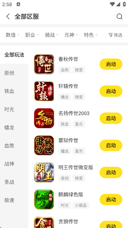用户们可以在全区服务器里面智能筛选出自己需要游玩的游戏,再点击游戏右边的“启动”按钮,启动游戏