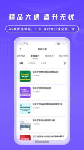 2、它开设了45类护理课程,300+课时专业课全面开放,修复了已知的线上精品大课,让用户无忧晋升。