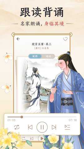 2、跟读背诵千古诵诗词提供了名家朗诵功能,让用户更深刻地理解和记忆古诗词。