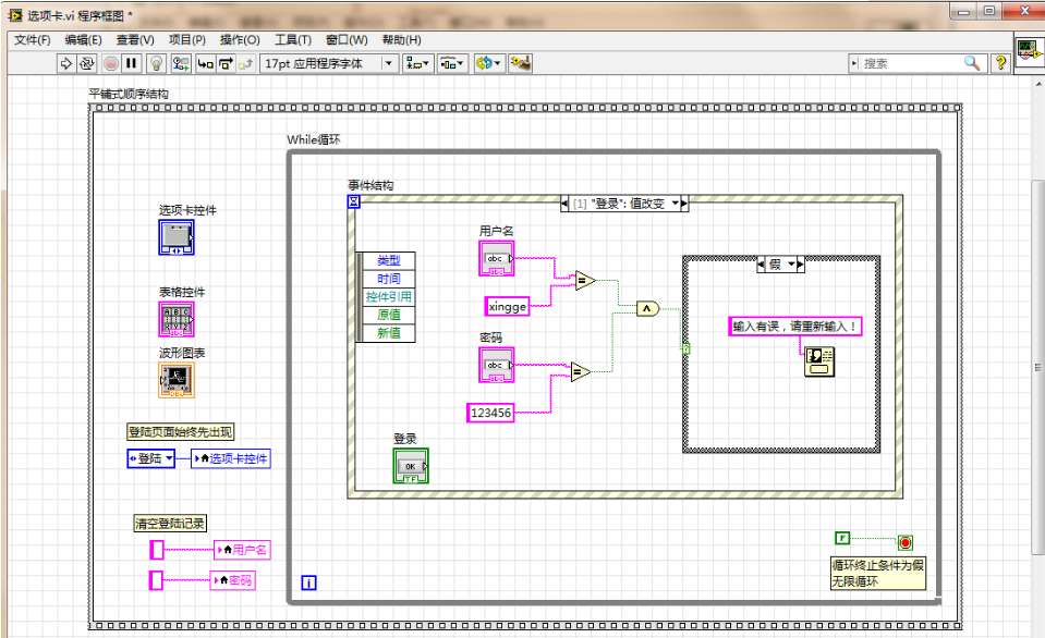 那么这两个界面在程序运行的时候,如何实现自动切换呢?我们用事件结构来处理: