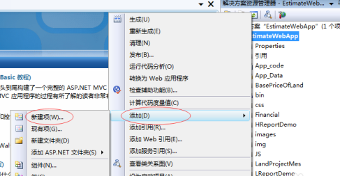 将鼠标移到解决方案处,点击鼠标右键,如上图中标红的位置,这个位置显示的是你的解决方案的名称。点击鼠标右键后在出现的菜单中将鼠标移到"添加"出现如下图的界面,请注意按照标红的位置跳转。