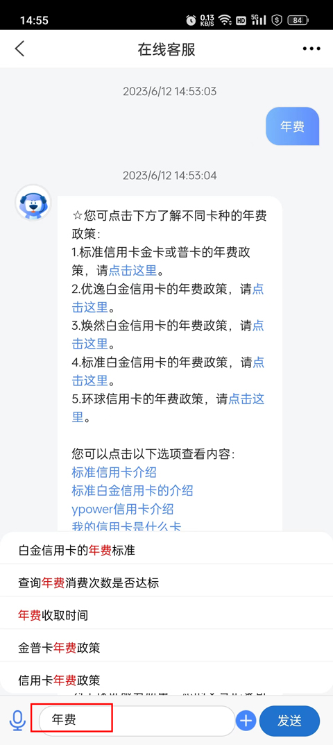 4、在输入框输入年费,然后发送就会回复各种年费详情,想查询哪一种就点击哪一种即可。