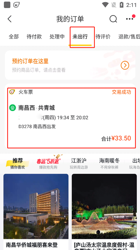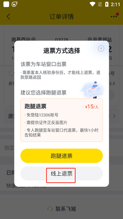1、发车前,未取票且距离发车5分钟前,可在飞猪订单中操作退票。