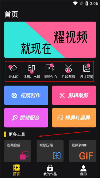1、打开视频剪辑软件app,首页有视频制作和剪辑的基本工具,可以导入视频剪辑;