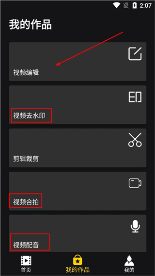 2、我的作品页面,可以把剪辑之后的视频做二次处理,可以配音、加水印加logo等;