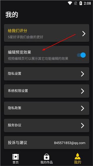3、我的页面可以设置视频剪辑效果预览和隐私设置。