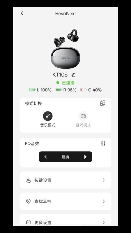 酷泽尔音频类产品连接管理软件,用户可通过软件跟酷泽尔蓝牙耳机进行通信,获取蓝牙耳机信息或设置蓝牙耳机功能,主要功能为电量显示、按键设置、EQ调节、查找耳机和固件升级等,一站式满足用户的使用需求,并能轻松操作。