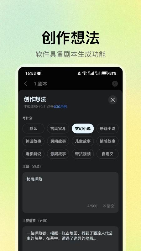 具备了强大的剧本生成工作,可以对自己的创作想法进行输入,选择生成的类型。