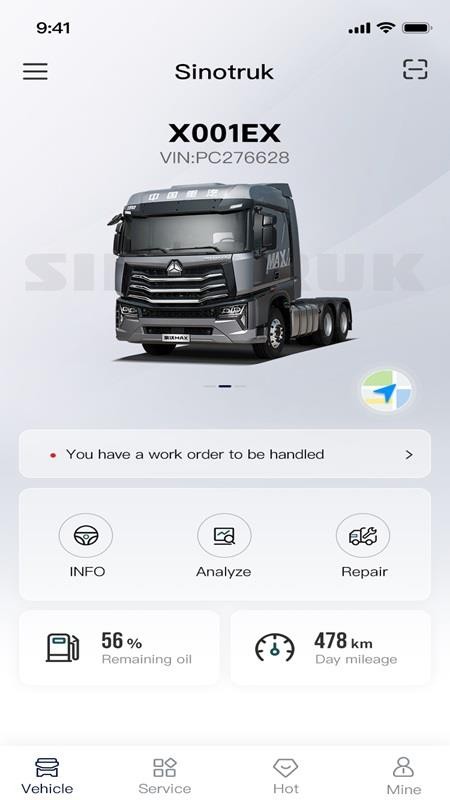SINOTRUK软件支持用户轻松便捷的用车,用户可以享受优质的用车服务,对自己的爱车信息来详细查看了解,更好的进行用车出行;而且用户也可以对周边的服务网站来进行手势,快捷检索周边销售,确保用户来进行无忧用车,以此来轻松出行。