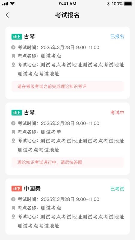 APP解决了用户日常繁琐的考级报名和参与考级的方式,轻轻松松就能通过软件完成报名,一站式满足用户的报名需求,便于高效且及时参与考级。详细的考级信息,在线可一览无余,知道考级内容和时间,便于备考和准时参与,保障考级的高效性;快来下载体验吧!