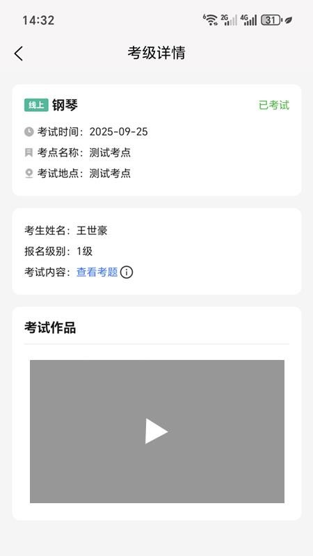 4、查看考级详情,知道考级状态和考生信息,还能观看考试作品;
