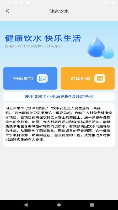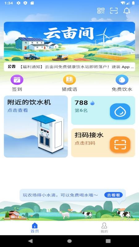 云亩间app支持用户轻松实现健康饮水,这里为用户提供了附近的饮水机,方便用户随时查询,有效进行定位搜索,快捷前往饮水机来进行扫码接水,进而可以畅享快乐生活体验,实现健康饮水;而且用户也可以畅玩休闲游戏,积累更多的小水滴,有效进行休闲放松。